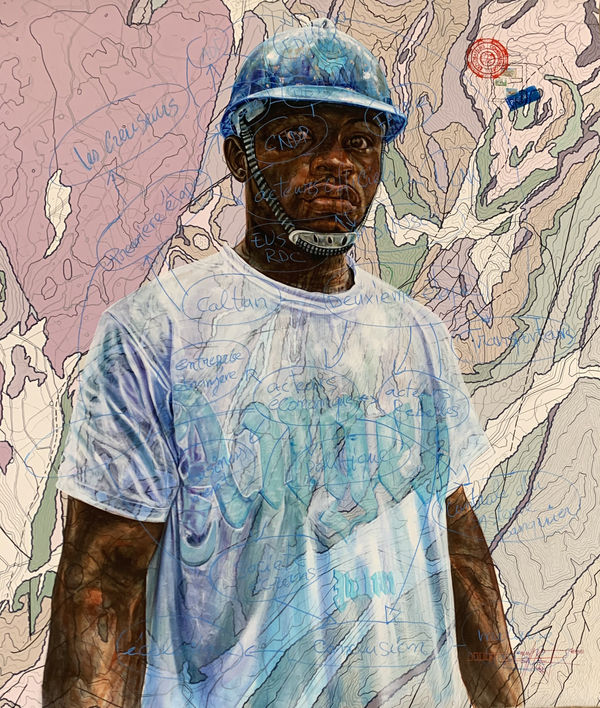 Le travail de Jean David Nkot met à l'honneur les figures invisibles de l'économie de marché, sans cesse rappelant le combat du corps sur le territoire. S'il dédie ses larges portraits à représenter celles et ceux dont le travail sert une société de consommation aux besoins intarissables, l'artiste camerounais prolonge ses recherches sur l'extraction minière entamées en 2020 et entreprend un travail scientifique inspiré d'une démarche archéologique. Alors que l'archéologie se concentre sur les corps et les objets enfouis venus de civilisations passées, Jean David Nkot, lui, s'adonne à ce qu'il appelle archéologie des corps . Il y explore et documente la trajectoire de vie de ceux qui oeuvrent sous le sol, à la recherche des minerais qui donneront vie aux biens technologiques distribués à travers le monde. -